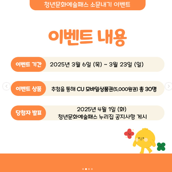 청년문화예술패스를 통해 보다 다양한 문화예술을 경험하고, 문화생활을 더욱 풍요롭게 즐기시길 바랍니다! 😊
